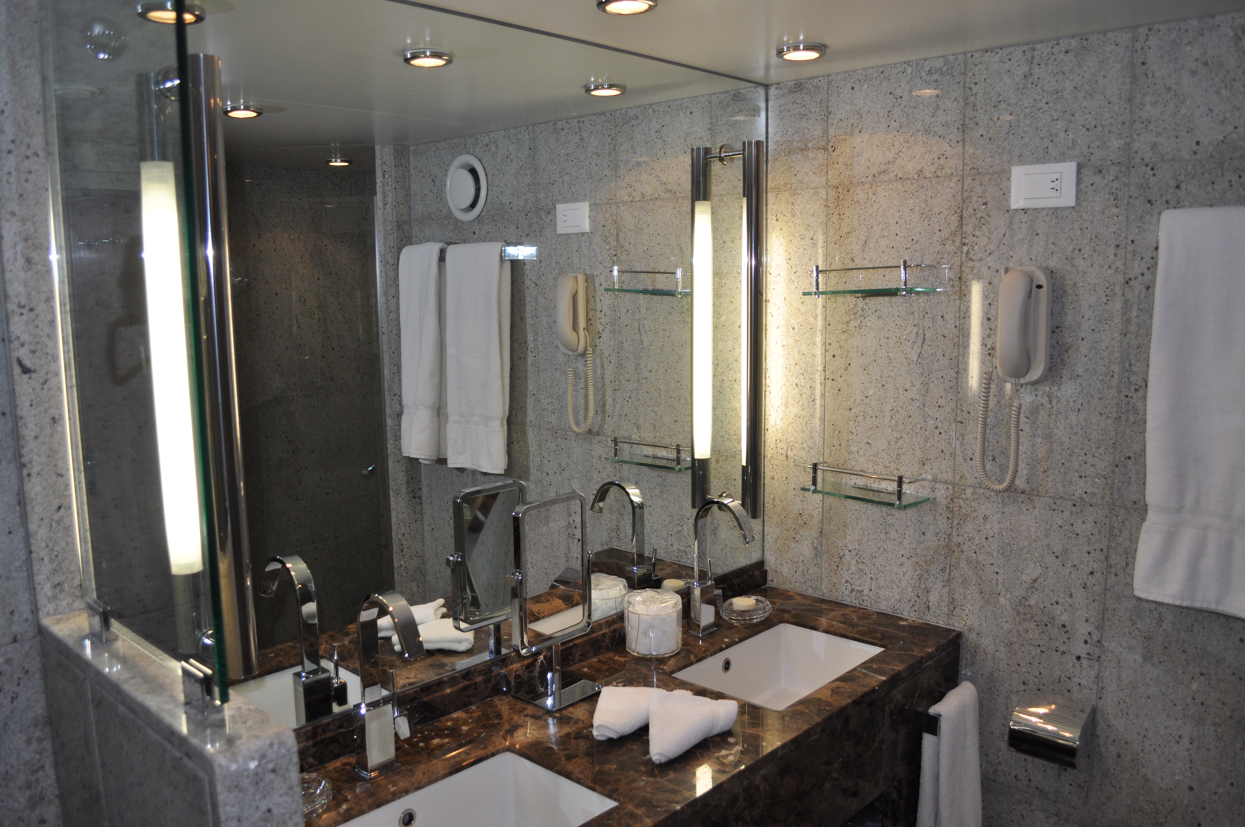 So …. It’s got to be nice. In fact it’s got to be lovely and special. Seabourn hit the nail on the head with it’s bathrooms on the Odyssey. No matter what category of suite you have – window, balcony or penthouse – all bathrooms feature a separate tub and shower as well as a double vanity. The shower is a corner unit with a well fitting glass door. That’s right – have you been on one of those cruises with shower curtains? Ugh – nothing feels as bad as that cold wet plastic slap on the behind. Personally I think shower curtains should be banned – but we don’t have to worry about that on Seabourn. The shower is equipped with a modern contraption of hand held shower and overhead shower. The water is hot and the pressure is strong. Go carefully – when I first switched on I felt like a protester at a G8 summit under fire from a water cannon. These are exactly the same shower units as on the AMAWaterways river cruises and the cruise director promised that they might seem complicated at first but after a week you will want to install one at home. All true.