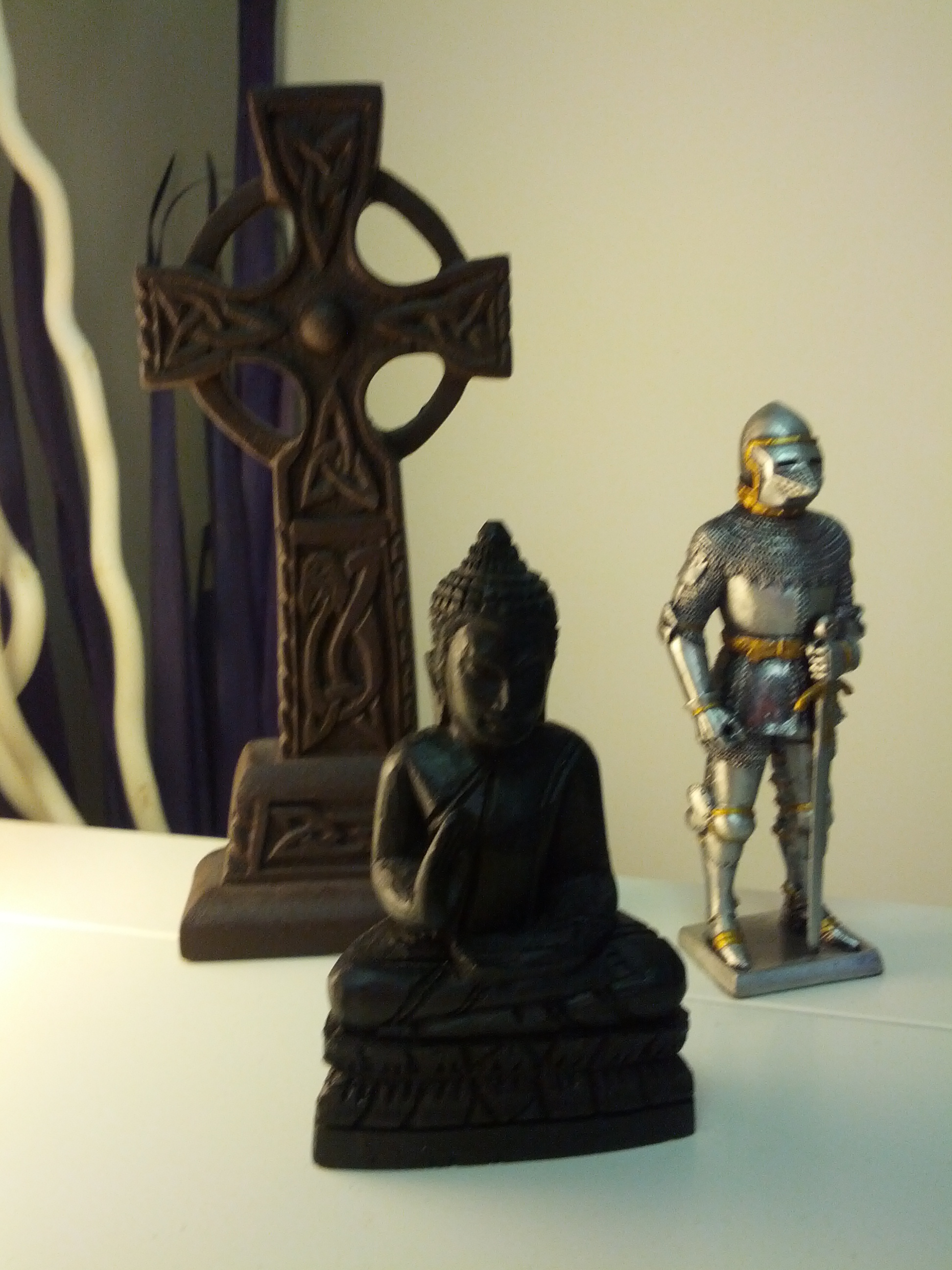 Mind you – I do have a few little bits and pieces that I am quite fond of. The peat Celtic cross I bought in Ireland, the medieval soldier from Germany and the Buddha from Vietnam.