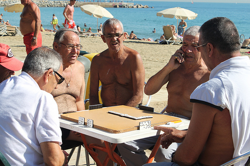The barcelonés are an interesting crowd.  Not really Spanish but Catalan and famous for the lisp in the “c” in Barcelona so that it sounds ” Barthelona”.  If you think Las Ramblas is the place to be – forget about it.  That’s not the real Barcelona.  Instead take a jog along the promenade of Barceloneta Beach – and do it early in the morning.  (Here at least jet lag is my friend).  Who plays dominoes at 7.30 am on the beach front?  Barcelonés do.  5 old guys, a few packs of cigarettes, yellowed ivory dominoes – what more could they want?  Maybe a skinny dip later on in the day.dominoes on beach