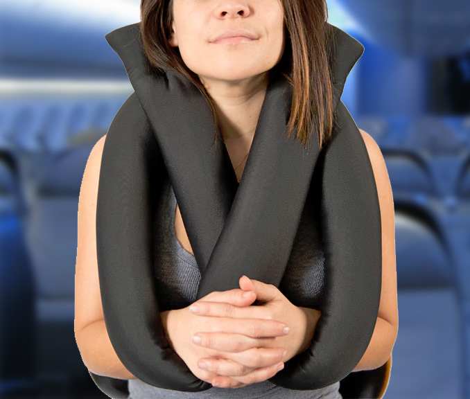 But getting a good night’s sleep on a long flight is tough – especially if you are in the “back of the bus” and don’t have the luxury of a lie flat bed and a cooing flight attendant supplying you with soft pillows, blankets and eye-masks. If you take a walk around any shop at the airport you will find no end of “devices” to help you sleep sitting up. Neck pillows of all shapes and sizes, some so bulky and inconvenient you just have to wonder where the heck to store them!