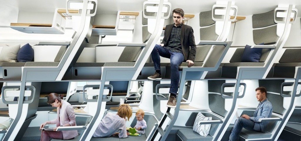 How about a double storey aircraft – half the seats on the higher level with access via a little ladder and the other half underneath? Everyone gets to stretch out and space out. This design has attracted the interest of several airlines. Would you like to travel like this?