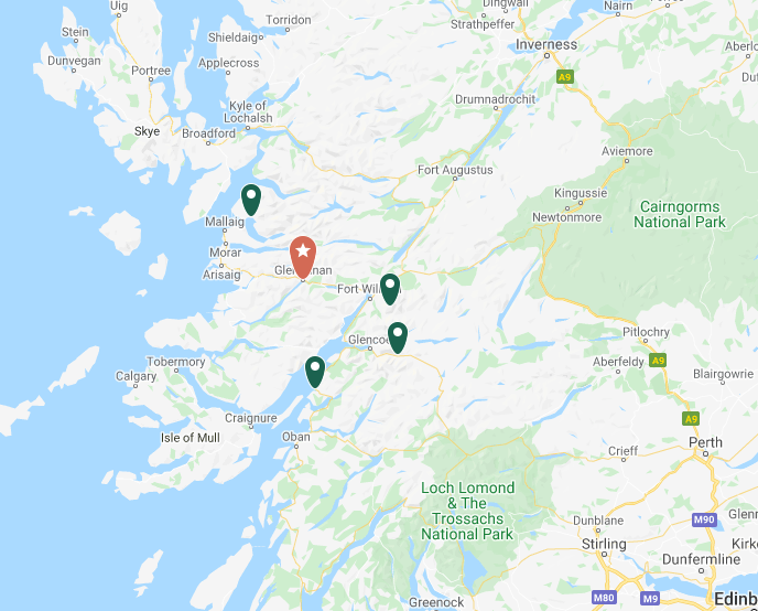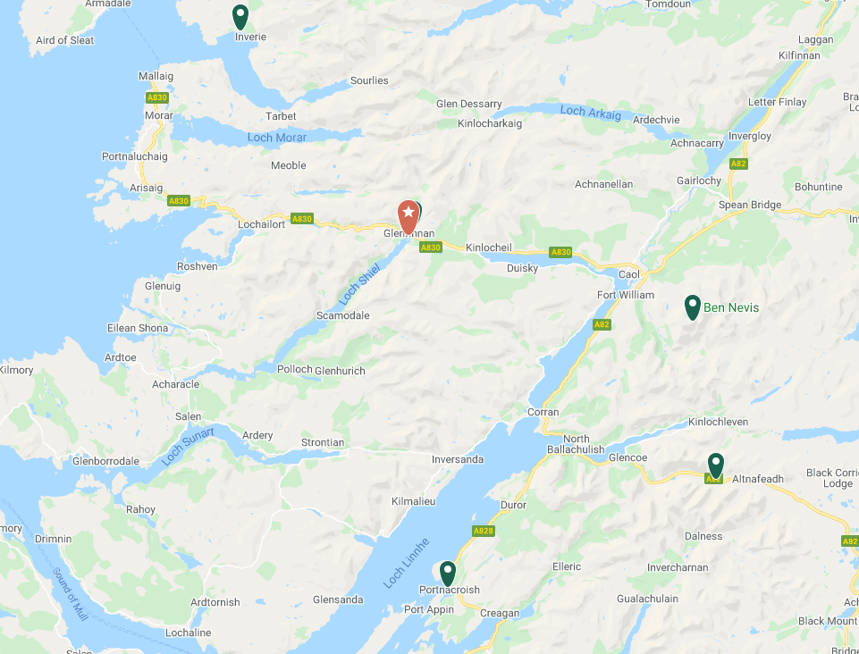 First of all before you even start looking for the leaning tower – just look at this countryside. It is magnificent. A close up of the map shows that Glenfinnan is located alongside a network of lochs – but look at the names.
