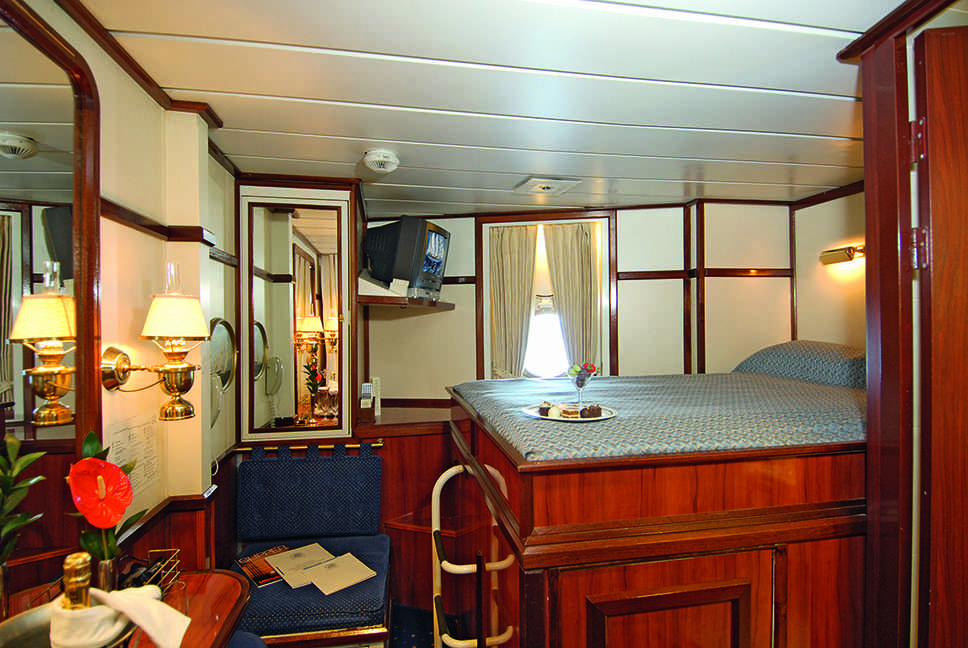 It was actually four foot high with a little ladder to get into bed. The reason is that it is right at the back of the ship as the yacht tapers. Now if you are the type who goes to the loo in the middle of the night when you are half asleep, this might not be the one for you. The benefit? You get category 5 price for the same size as a category 4 – except you climb the ladder to go to bed. They said it was very comfortable – except for a flood in the bathroom. That’s another story!