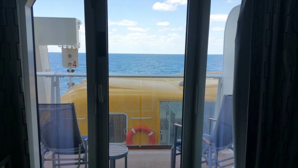 OK – let’s leave out the ocean view and go big time – veranda or nothing! Good choice. But there are verandas and then there are verandas. What does this mean “metal” veranda. Well it means the room is in that part of the ship where it narrows towards the front usually and instead of having a glass balcony wall you get a solid metal one. Sure you still have a veranda but unless you are six foot tall you have to stand up to see the view. Not my favourite. Or sometimes you just have that jolly old life boat in the way.